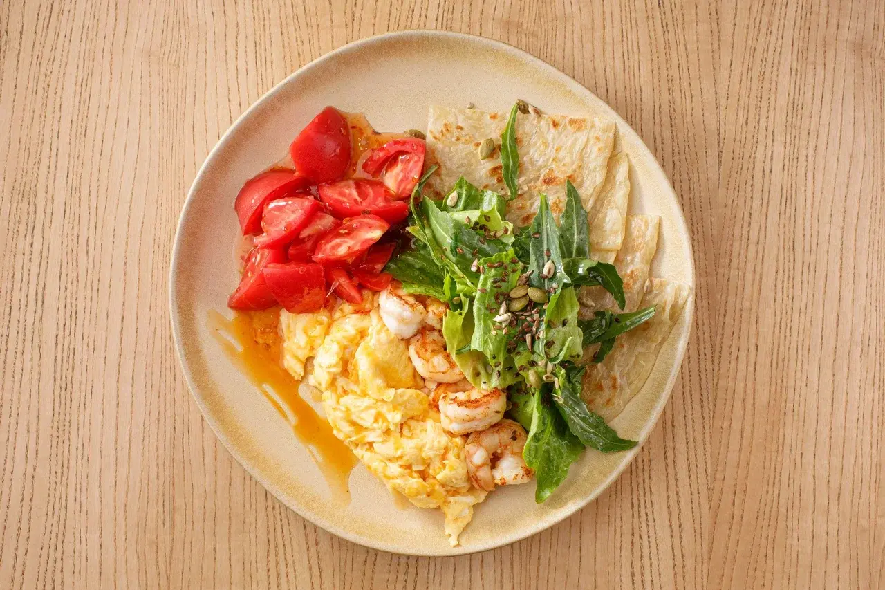 Скрембл, обжаренное куриное филе, стручковая фасоль с моцареллой, ливанская пита, салат с огурцом и помидором. Завтраки доступны к заказу до 14:00!