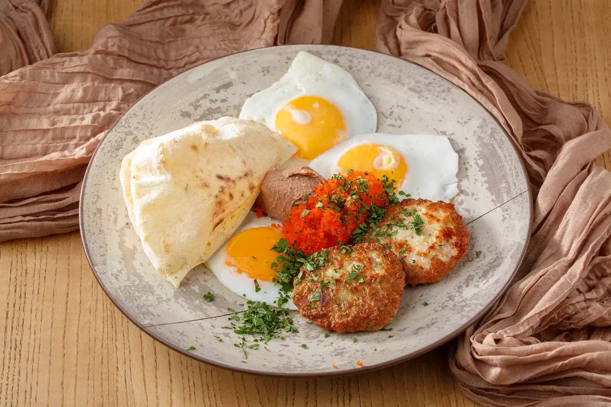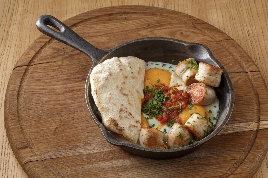 Два глазка, сардельки Халяль, чесночные чипсы, картошка по-деревенски с грибами в сливочном соусе, ливанская пита, салат помидор-романо в цезаре. Завтраки доступны к заказу до 14:00!