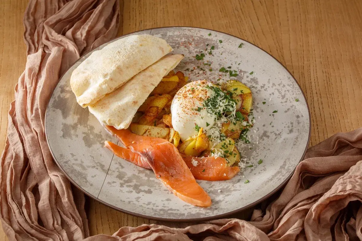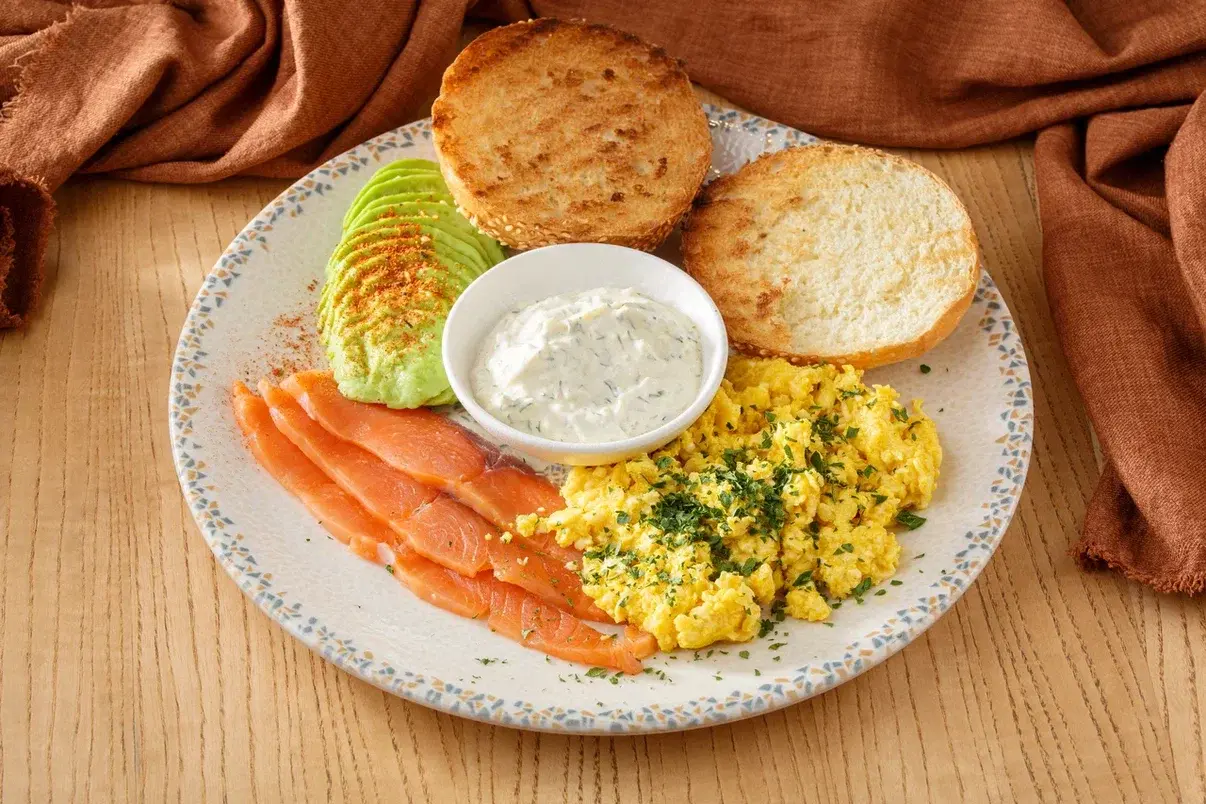 Лосось, омлет из двух яиц с моцареллой, авокадо, ливанская пита. Завтраки доступны к заказу до 14:00!