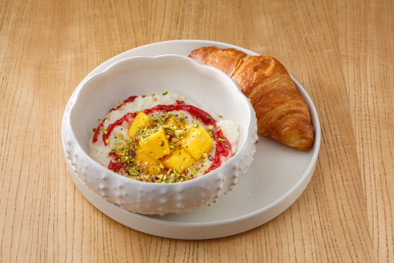 Овсянка, сезонные ягоды и фрукты, семена чиа, молоко. Завтраки доступны к заказу до 14:00!