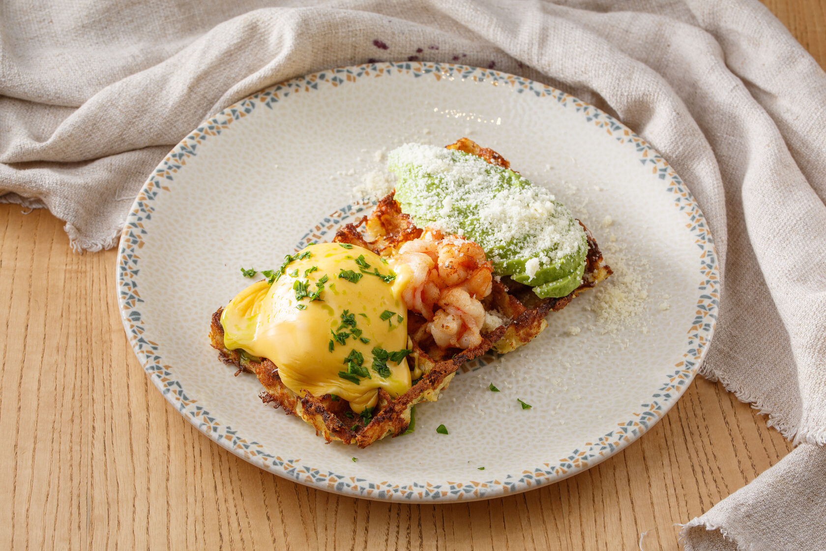 Венская вафля, свежий лосось, авокадо, творожный сыр, сырный соус. Завтраки доступны к заказу до 14:00!