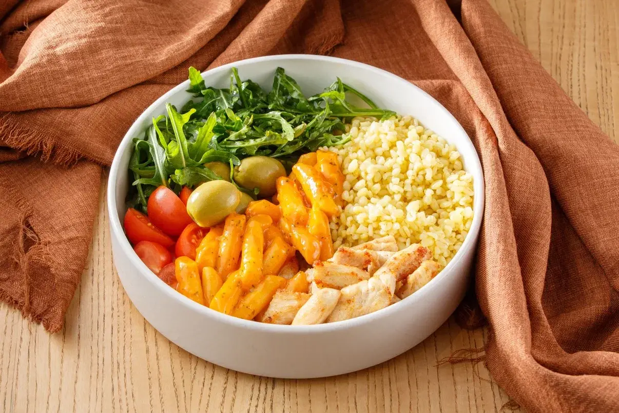 Скрембл, обжаренное куриное филе, стручковая фасоль с моцареллой, ливанская пита, салат с огурцом и помидором. Завтраки доступны к заказу до 14:00!