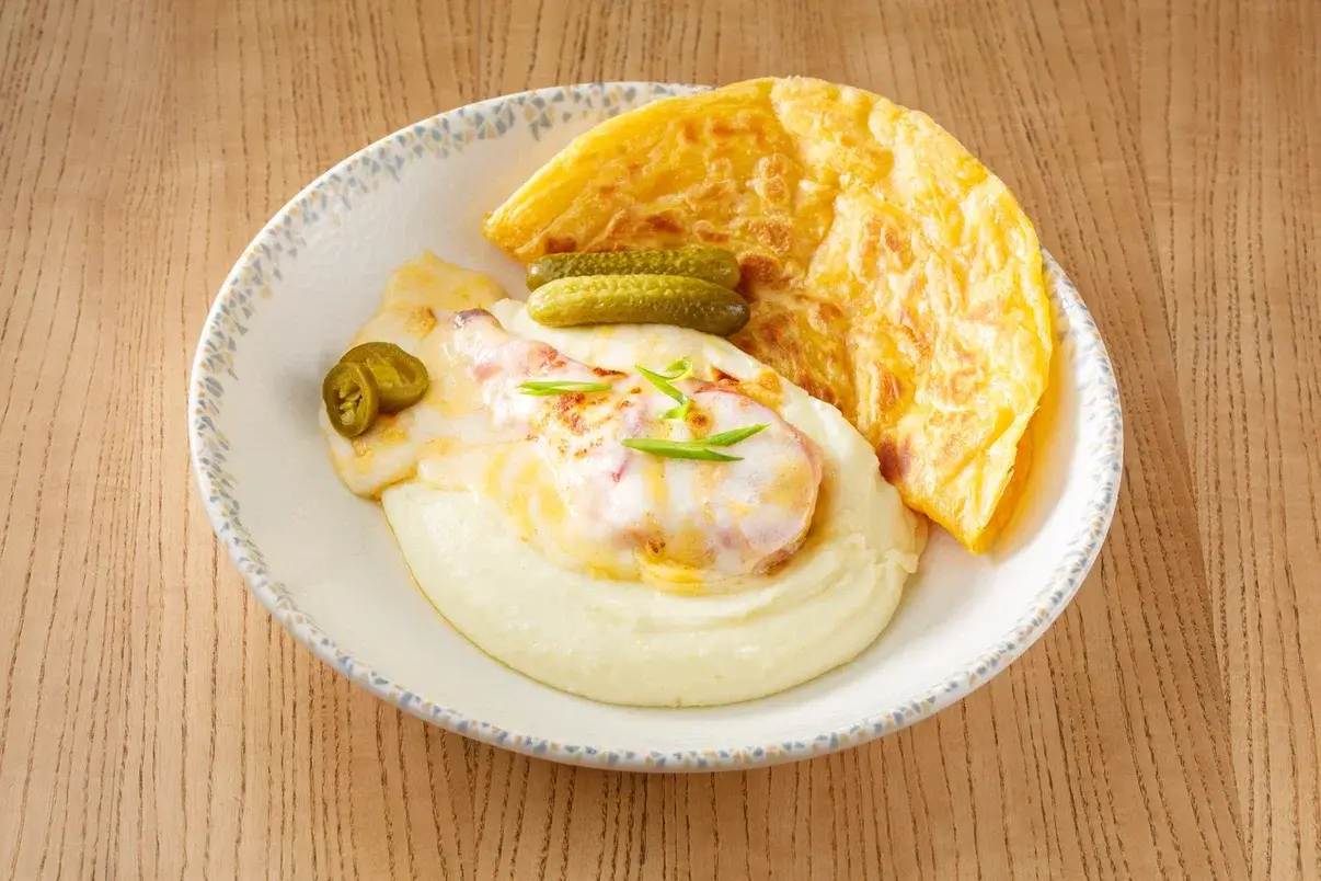 Два глазка, сардельки Халяль, чесночные чипсы, картошка по-деревенски с грибами в сливочном соусе, ливанская пита, салат помидор-романо в цезаре. Завтраки доступны к заказу до 14:00!