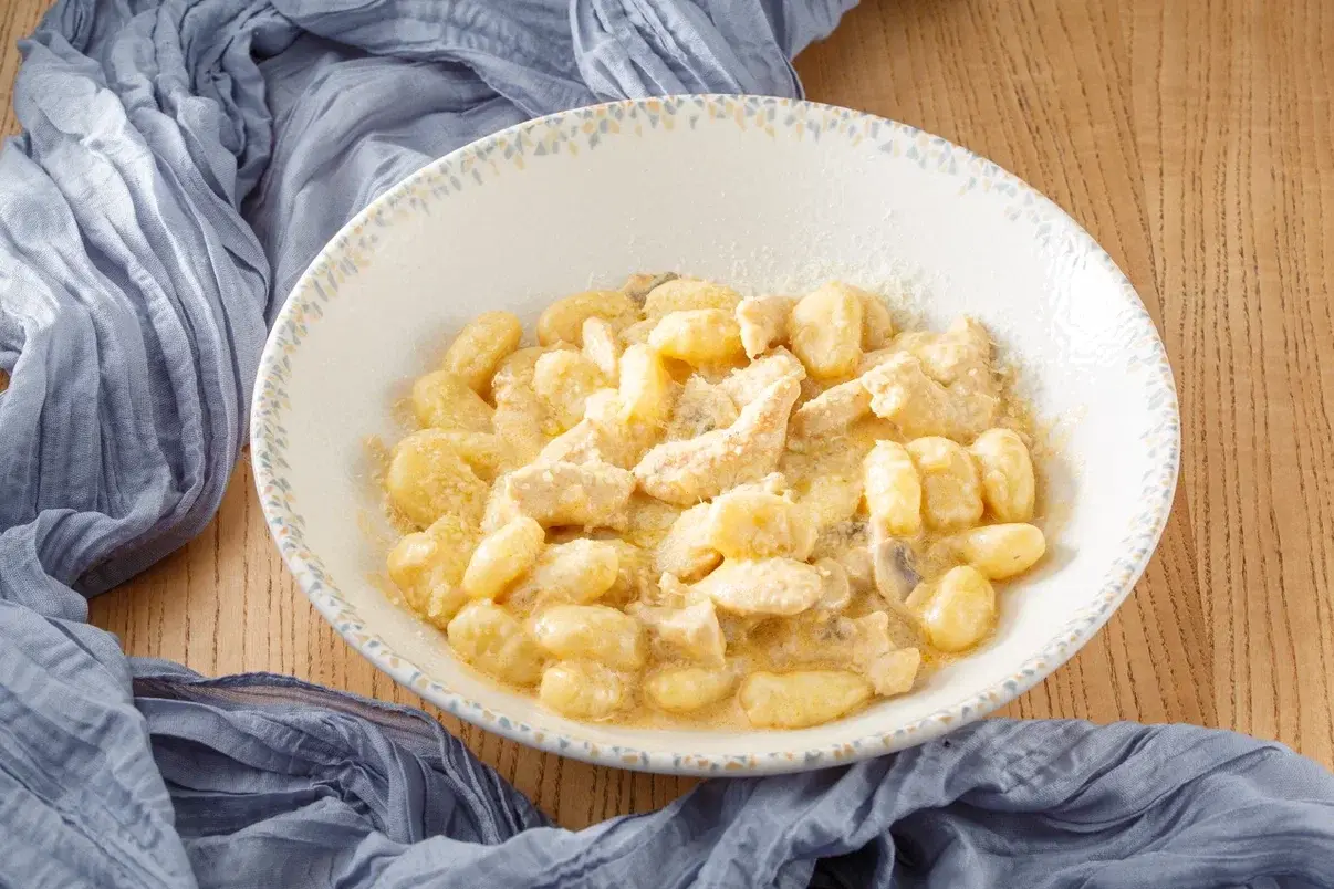Глазунья с пюре, сосисками и грибами в сливочном соусе